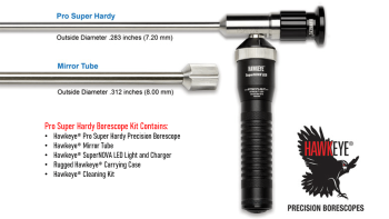 Borescopes are rugged and bright. The quarter inch diameter Pro Hardy gives 3x the illumination of the Pro Slim. The Super Hardy is slightly wider at .283 inches, and is available in lenghts of 28 and 37 inches.