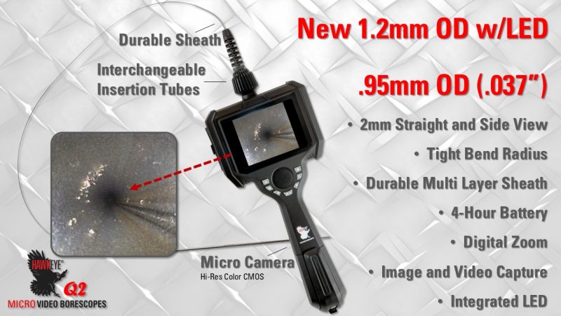 The Hawkeye Micro Q2 Video Borescope delivers advanced imaging performance in an exceptionally compact design, with diameters as small as 0.95mm. Featuring a camera in the tip, the Micro Q2 provides a full-screen, high-resolution image that’s eight times sharper than the MicroFlex Fiberscope. Its innovative design offers a tighter bend radius and greatly improved durability, eliminating costly image fiber damage and reducing the need for frequent repairs.